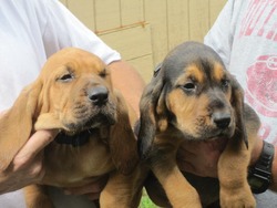 Email K &C Two akc bloodhound puppies for sale. One Red Female and one black and tan male.