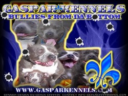 Email Gasparkennels.com We are a small family owned kennel located in South Louisiana. Here we strive to produce high quality pit bulls with bloodlines consisting of..... "Greyline", "Razorsedge" "Mikelands" and "Gottiline"! Our #1 goal is to produce short, wide and stocky bullies, but above all...GREAT TEMPERAMENTS! Please feel free to look around and let us know what you think. Thanks again for visiting "Gaspar Kennels" if you have any other questions, please feel free to call me at (985) 688-6696 or (985) 575-3927.SouthernMade504 APBTs