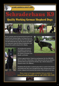 Email Schraderhaus K9 Our breeding stock consists of the bloodlines of precious old working foundation lines from the countries of Germany, Czech Republic, and Slovakia. Our Primary Focus is on producing beautiful and healthy dogs with structurally sound and solid working body type; dogs who possess and exhibit good temperament along with balanced working drives, thereby producing offspring who are also a pleasure to live with. Correct working body structure along with soundness of mind are extremely important within our breeding program, with our goal being to produce offspring with the same solid qualities so evident in the breeding stock we choose to mate together. Selecting correct working conformation coupled with keeping an eye towards beauty, while never breeding for the sake of looks alone, continues to produce dogs from our kennel which possess the correct balanced drives and which are also pleasing to look at. We will not sacrifice these goals simply to produce high-drive, overly aggressive dogs.