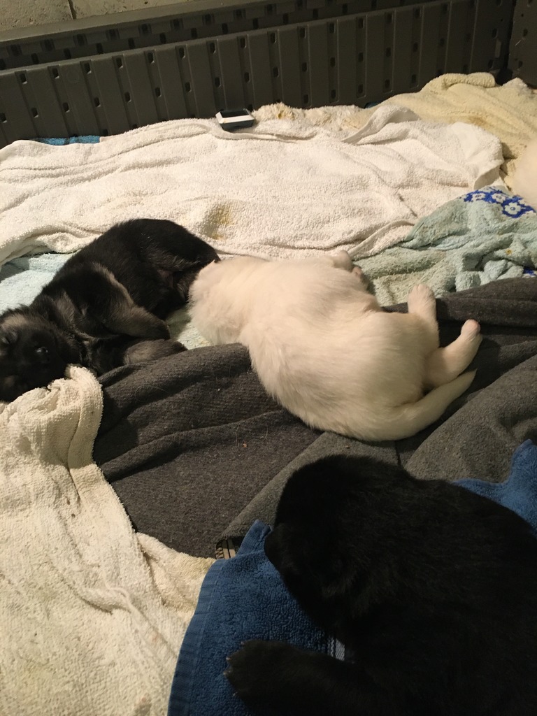 Email Snyder's German Shepherds AKC registered German Shepherd Dog puppies for sale. Parents both have champion lines (Royal Airs and Tumbledown). Mom is a solid black, large female at around 27 inches tall and 100 pounds. Dad is solid white, very large, standing around 33 inches tall and weighing around 130 pounds. 6 puppies are available (3 males and 3 females). 2 solid blacks, 2 solid whites and 2 black and silver or sables. Parents and puppies are AKC registered and Mom is OFA tested with good hips and normal elbows, clear of DM gene as well. Dad is clear of DM gene. MALES - $1.200.00 EACH FEMALES - $1,000.00 EACHSnyder's German Shepherds - Puppies for Sale